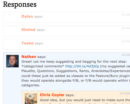 Chris Coyier thought of a smart idea for a plugin. Two more buttons for comment moderation:feature and bury, handy to highlight comments that add value to your post. Utkarsh Kukreti created Feature/Bury Comments plugin for WordPress. This plugin lets the admin add “featured” or “buried” css class to selected comments.