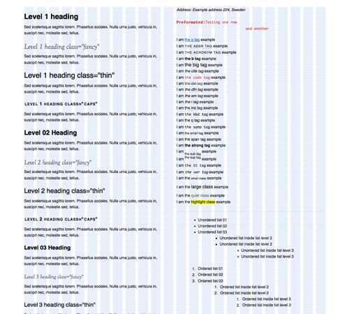 Emastic also includes typography and other pre-defined styles. The overall design options are based on a grid-layout. The grid is made from blocks sized with em units (from 5 to 75em). You can change the default sizes of the em units by changing the body font-size tag.