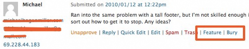 Chris Coyier thought of a smart idea for a plugin. Two more buttons for comment moderation:feature and bury, handy to highlight comments that add value to your post. Utkarsh Kukreti created Feature/Bury Comments plugin for WordPress. This plugin lets the admin add “featured” or “buried” css class to selected comments.