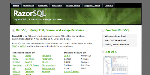 RazorSQL is an SQL query tool, database browser, SQL editor, and database administration tool for Windows, Mac OS X, Linux, and Solaris. RazorSQL has been tested on over 29 databases, can connect to databases via either JDBC or ODBC. Its available for $59.95.