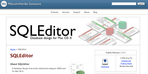 A Database design and entity relationship diagram (ERD) tool for Mac OS X. SQLEditor replaces typing SQL by hand with dragging, dropping and clicking. It makes creating databases much faster and really reduces errors.