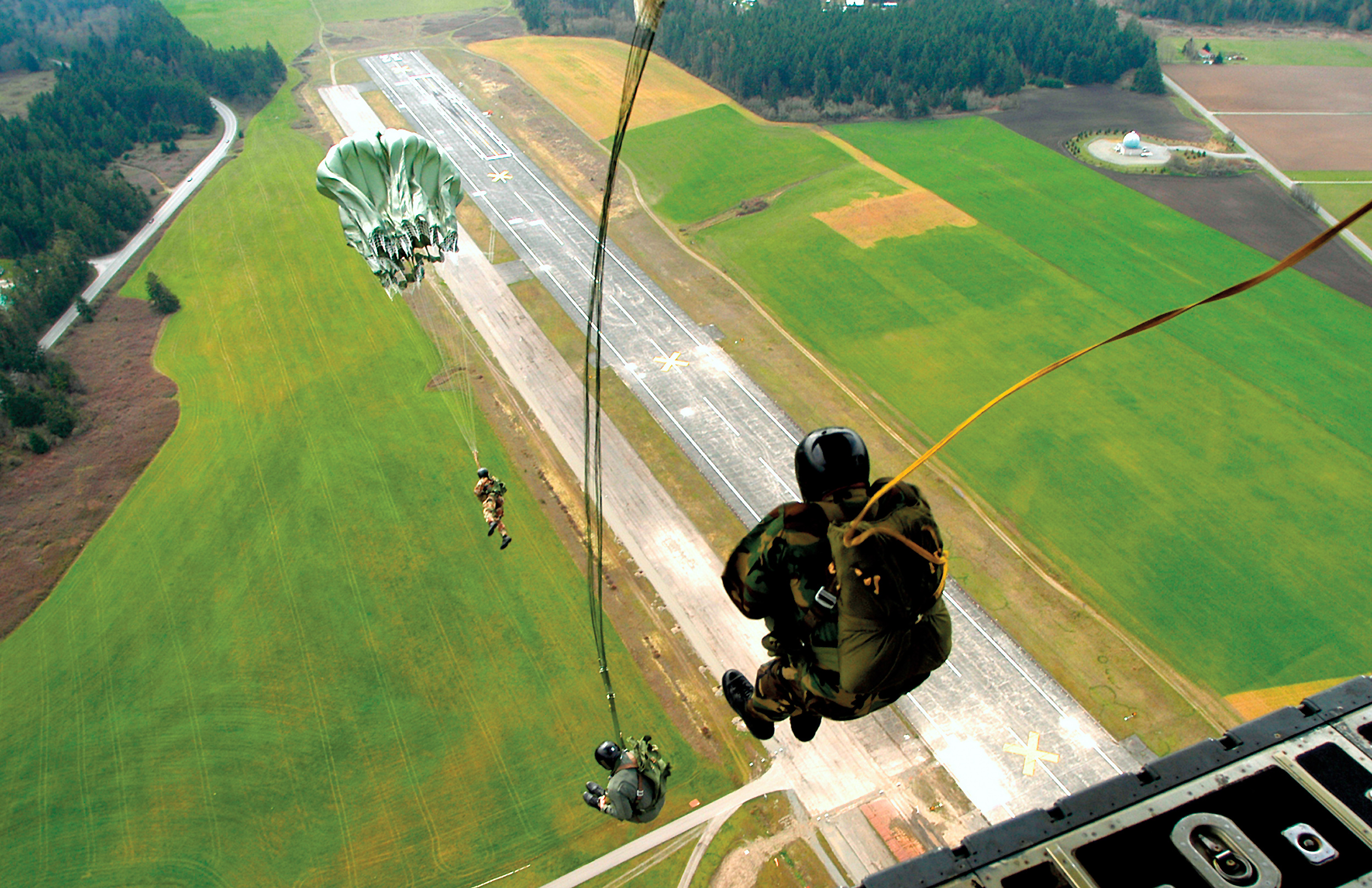 Oak Harbor, Washington: Explosive Ordnance Disposal Mobile Unit Eleven (EODMU-11) members perform a static jump from the ramp of a C-130 Hercules, in groups of three.