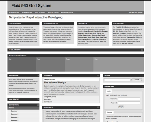It uses Mootools FX.Elements for some added functionality, as well as some jQuery scripts. It’s based on the grey box method to make prototyping faster, though it’s also suited for a production environment.